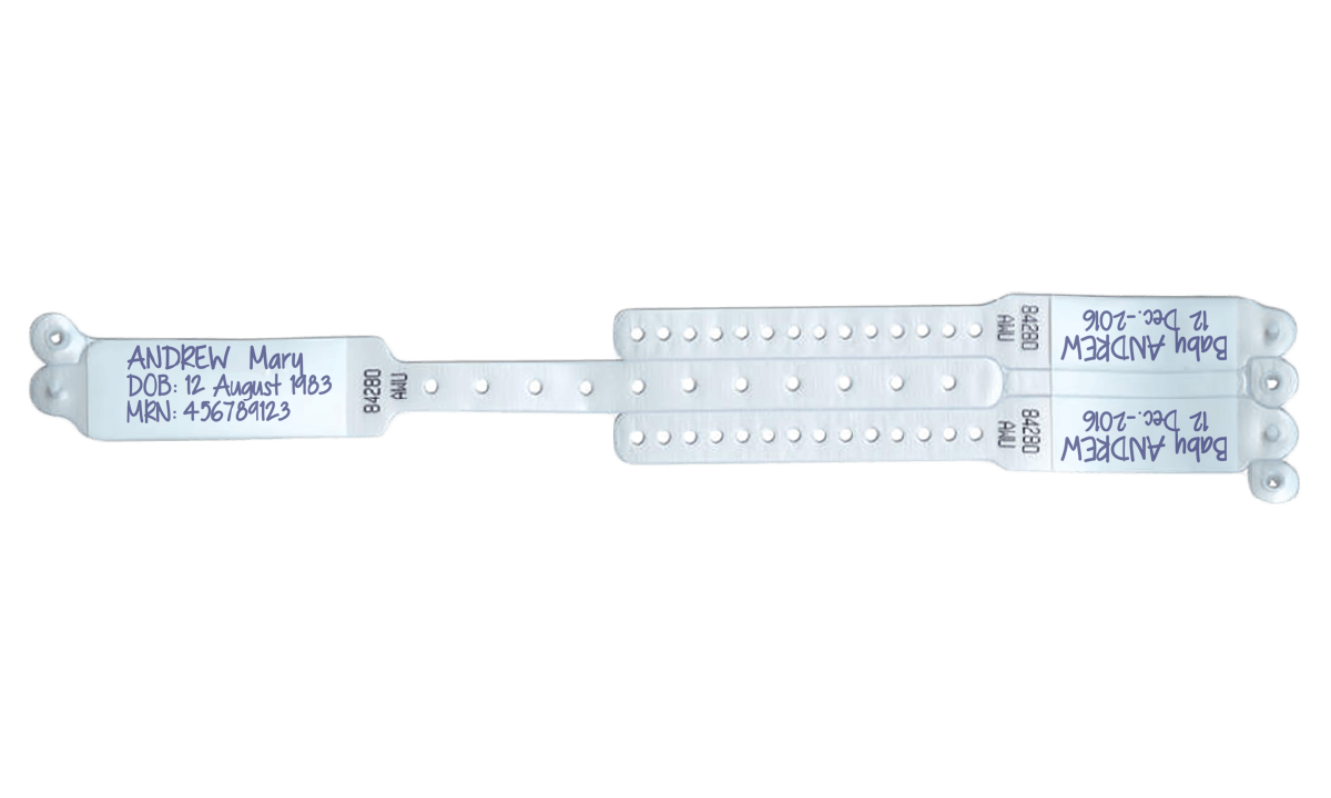 Onze Speedi-Print polsbandjes voor directe inscriptie voor moeder en kind zijn gemaakt van zacht vinyl met niet-snijdende randen om het comfort van de patiënten te garanderen. Deze doos bevat 100 setjes van 3 polsbandjes (1 polsbandje voor volwassenen & 2 polsbandjes voor kinderen).